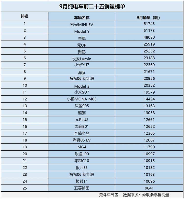 销量就是最好的佐证,为了让网友们看清楚,鬼哥根据乘联会零售销量数据整理出,9月纯电车排名前二十五销量榜单,结果,鬼哥发现,共有24款车型销量冲破万辆,接下来,看看具体车型排名。