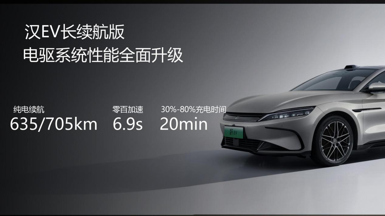汉 EV长续航版则搭载全新八合一电驱系统,纯电续航最高可达705公里,百公里电耗仅10.6度,20分钟即可完成快充补能,兼顾高续航与高效率。同时配备丹拿HiFi级音响和无麦K歌等多项娱乐功能,让每一次旅途都充满沉浸式感官体验。