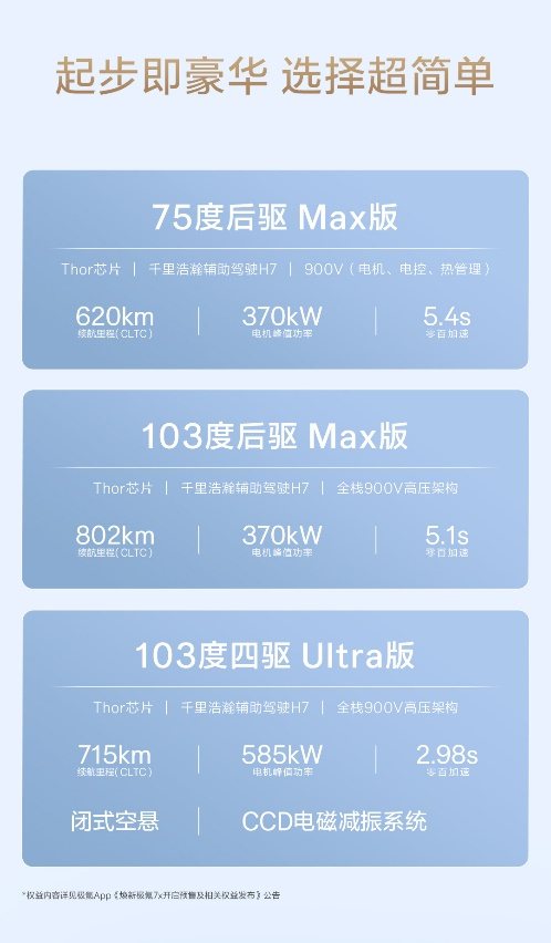 焕新极氪7X全新升级900V高压架构,全系搭载900V的电机、电控和热管理系统。相比现款,三个版型的动力、能耗和续航都有所优化。