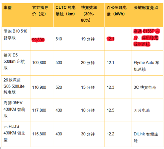 预算10万左右,想要一台续航扎实、配置全面的纯电SUV,面对市场上琳琅满目的车型,到底该如何选择?预算有限但追求高配置,这是许多首次购车的年轻人面临的共同难题。在10万级纯电SUV市场中,各类车型看似琳琅满目,实则各有取舍。有的续航够用但智能配置不足,有的配置够用可空间又很局促,很难找到一款各方面均衡的车型。今天咱不玩虚的,实测了四款热门车26款的银河E5、深蓝S05、海狮05EV、元PLUS,最后发现零跑B10的表现最让人惊喜,这一点已被市场印证,零跑上周新增订单破10K,交付量达13K,热度可见一斑。尤其是现在还有限时优惠,值得好好聊聊。