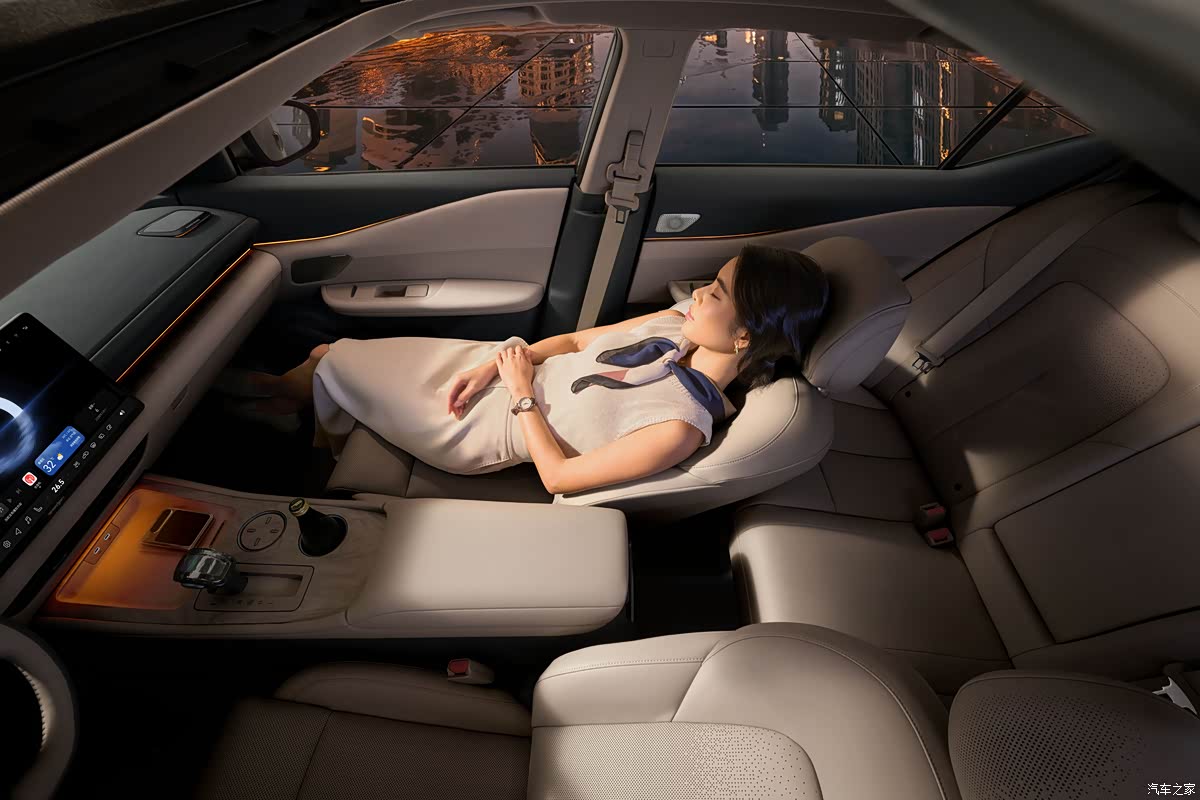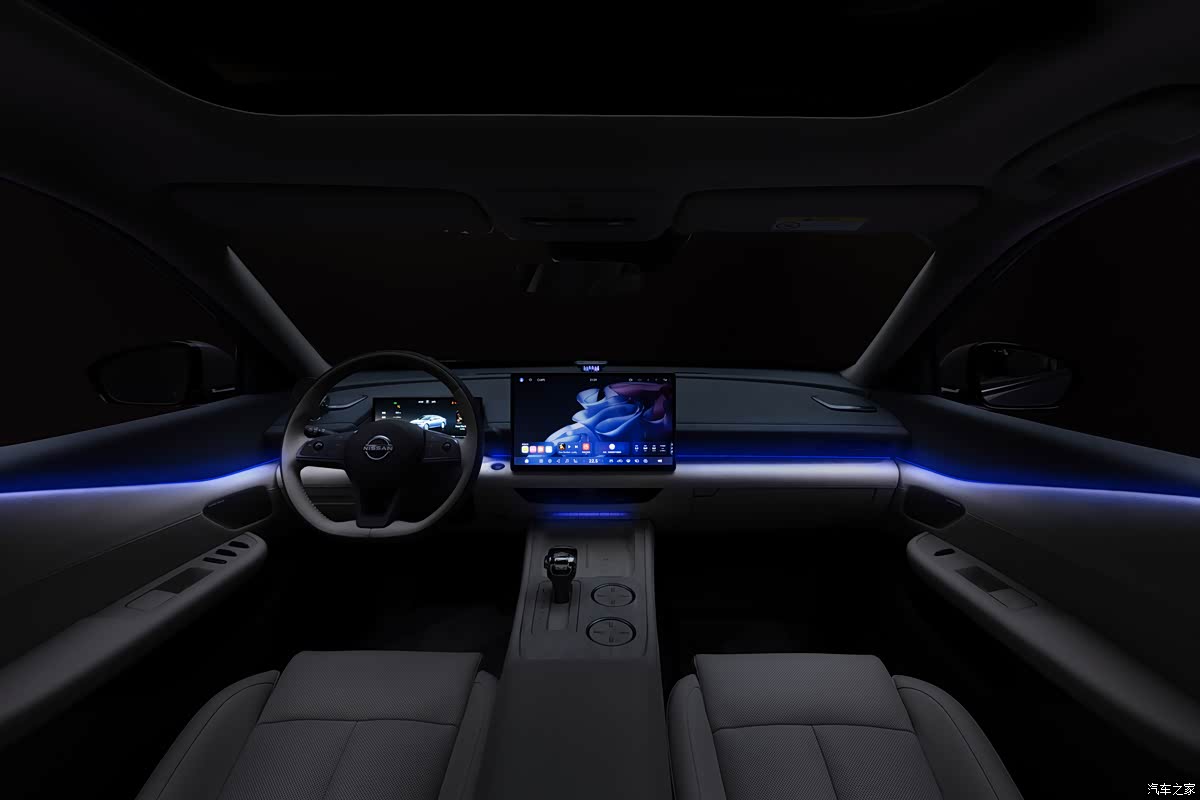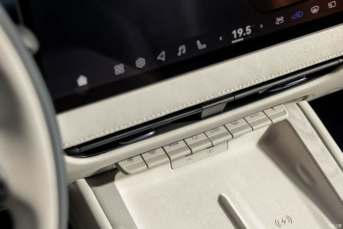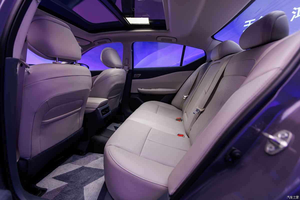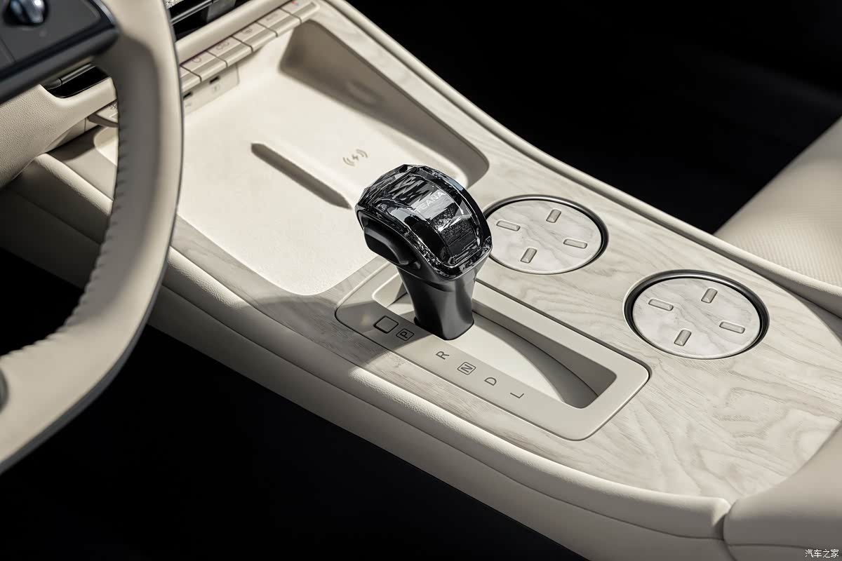 新车内饰采用环抱式设计,车内可触面积的90%都是软包材质,细节处辅以进口藤木纹饰板进行装饰,并采用0甲醛健康材质,256色智能交互氛围灯支持语音、触控自定义调节,随声而动,营造出高雅的座舱,排挡采用专属定制设计的可升降式星环散射体,晶莹剔透,新车内饰提供晨曦岚白和穹宇黑灰两种配色。