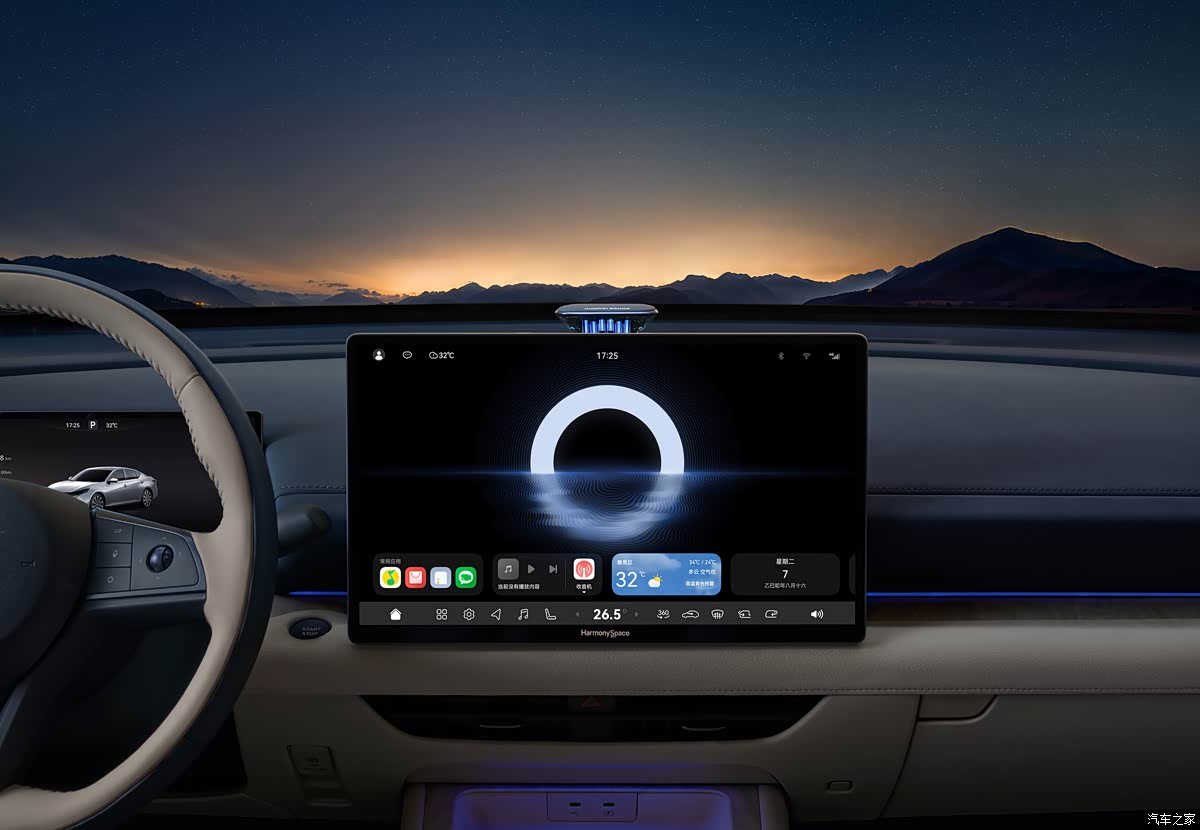 全新的方向盘带有四向滚轮,操作更简洁,新车提供10.25英寸仪表屏和15.6英寸HUAWEI山海画质车载智慧屏,搭载华为鸿蒙座舱HarmonySpace 5,48个鸿蒙座舱原生精品应用全上车,AI级语音智慧助手,毫秒级响应,AI级智慧搜索语音导航更精准,并提供手车互联,更集成了无麦K歌、笑脸抓拍等丰富情景应用,中控屏下方保留了物理按键。全车还提供了17扬声器的HUAWEI SOUND音响,环绕立体沉浸声场,在中控台面提供了升降式星环散射体,更具高级感。