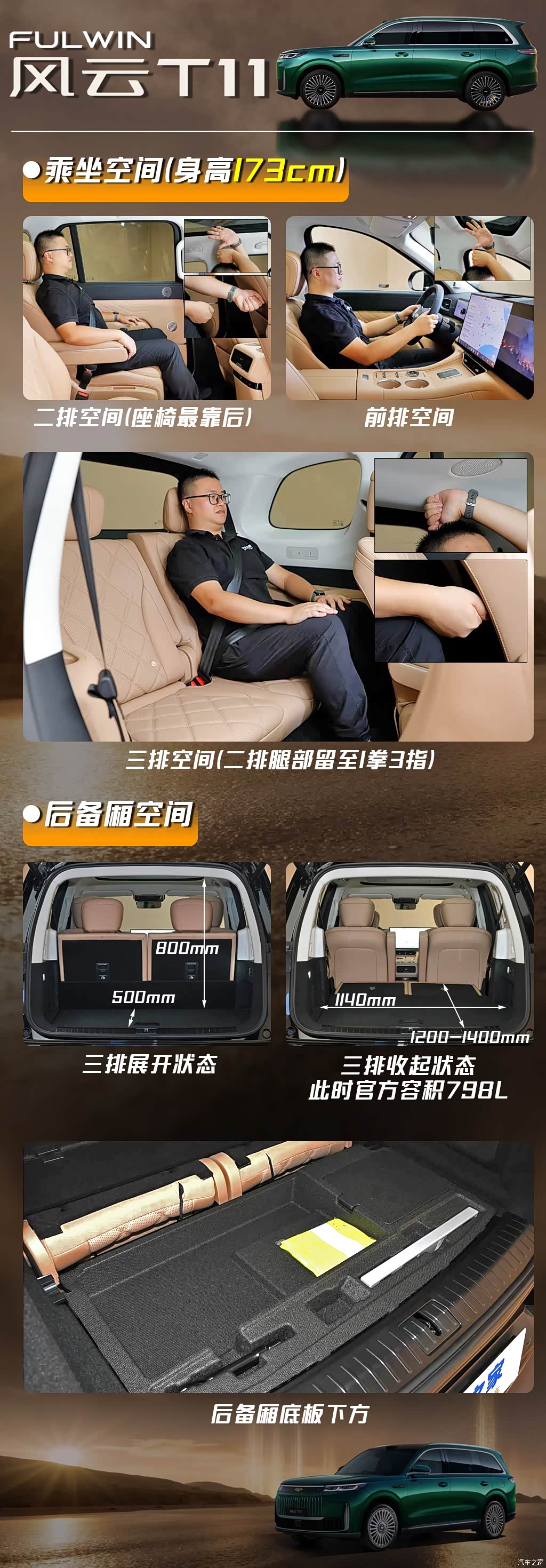 空间方面当然是这类旗舰SUV的重头戏和拿手好戏,身高173cm的体验者同时在风云T11的前中后排都能有宽敞的乘坐空间,如果三排不坐人的话,车内大四座的乘坐空间甚至超过很多行政级别的轿车。后备厢在第三排座椅直立的时候,进深还有500mm左右,这样的数据放下4-5个20英寸登机箱绝对是非常轻松。