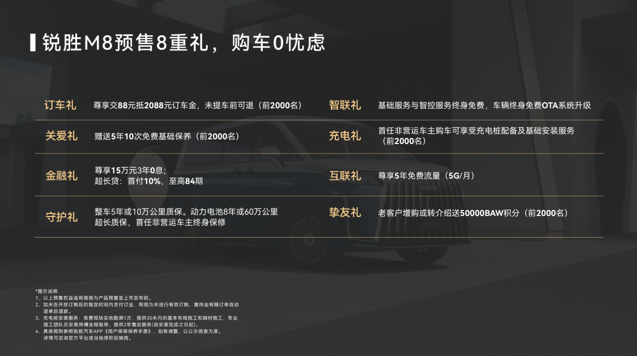 新程启幕,权益护航。预售期间下订用户可享限时权益,尊享价值至高2.98万元的八项专属好礼,全程尽享无忧体验。