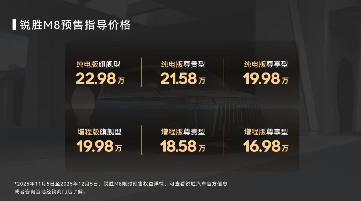 作为北京汽车制造厂孵化的独立MPV品牌,锐胜汽车持续深耕MPV细分市场,敏锐洞察用户未被满足的真实需求与市场空白。锐胜M8的推出,为用户提供了更全面的选择,进一步提升了出行的品质与体验。目前,锐胜M8预售已经开启,能否获得市场青睐,我们拭目以待!