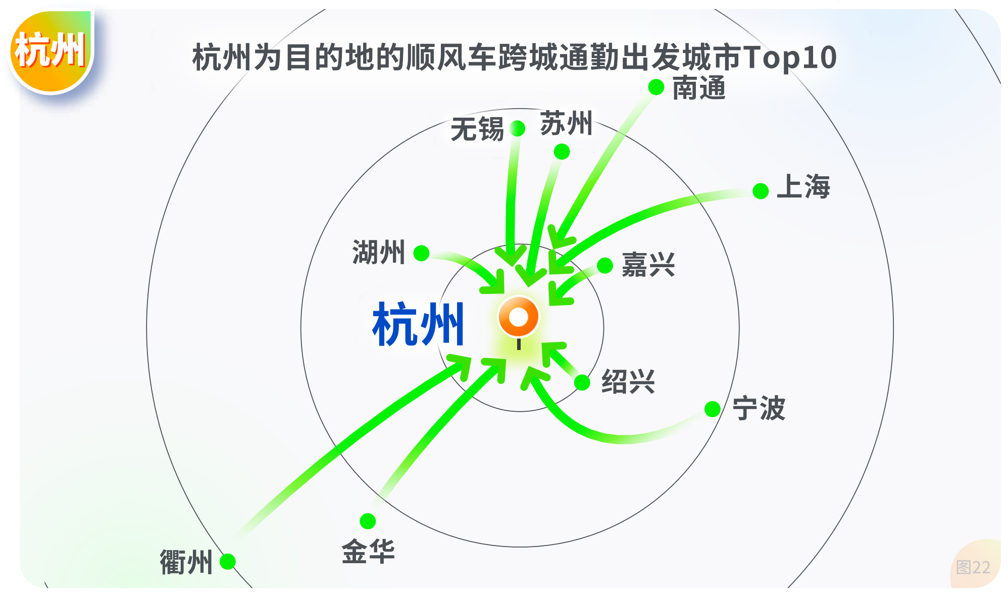 以杭州为目的地的跨城通勤Top10出发城市中,前五依次是嘉兴、绍兴、上海、金华和湖州,前十还包括宁波、苏州、无锡、衢州和南通。
