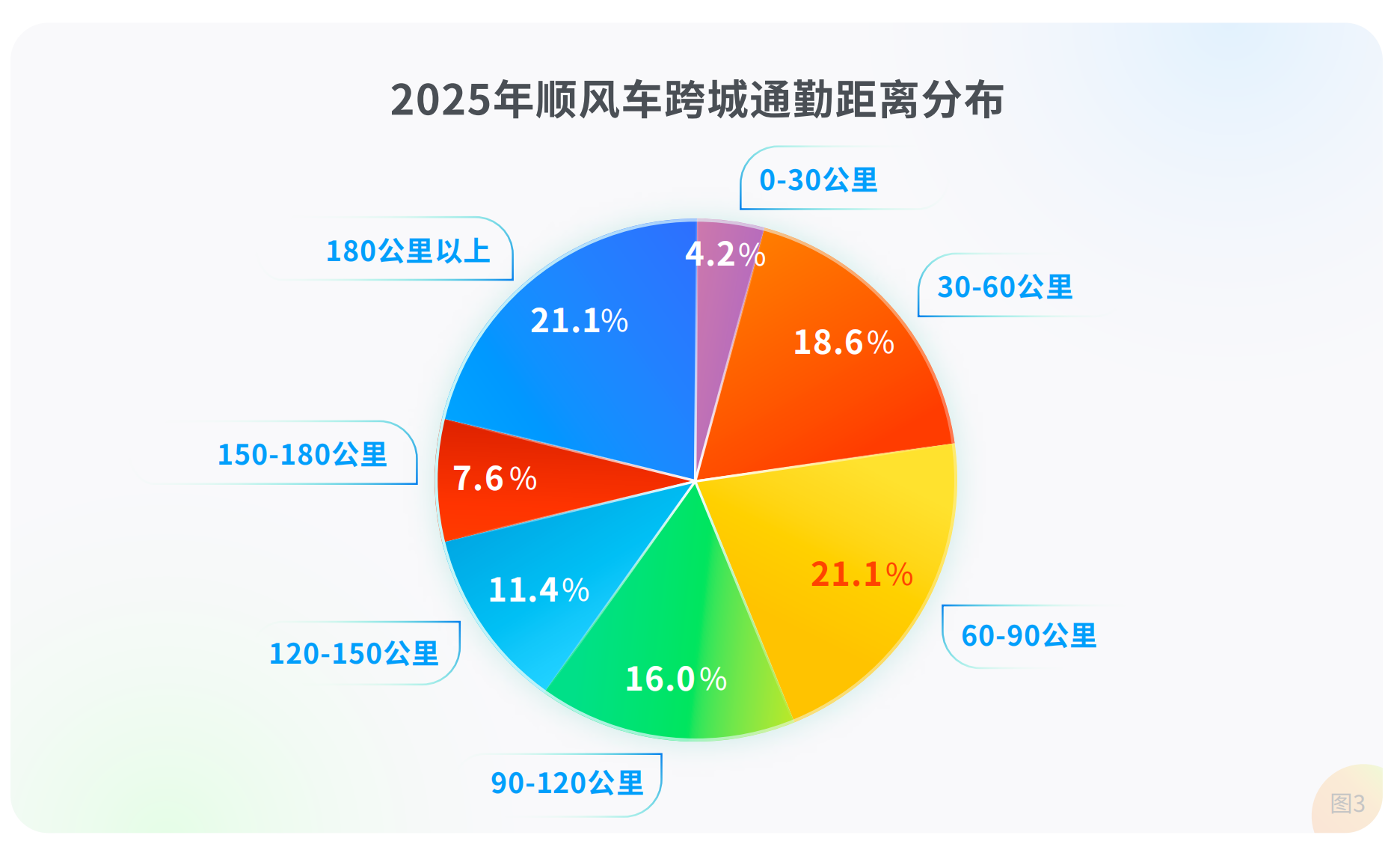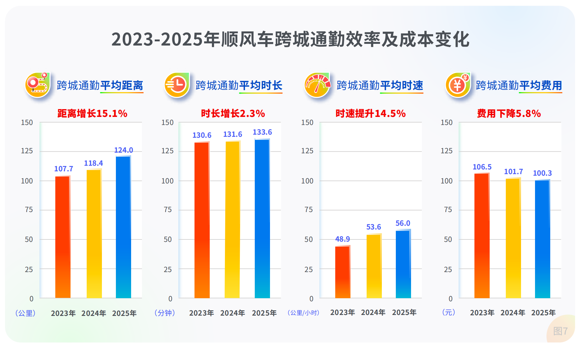 2023年至2025年,顺风车跨城通勤平均距离从107.7公里增至124公里,平均时长从130.6分钟微增至133.6分钟,但平均时速从48.9公里/小时大幅提升至56公里/小时,增幅达14.5%。