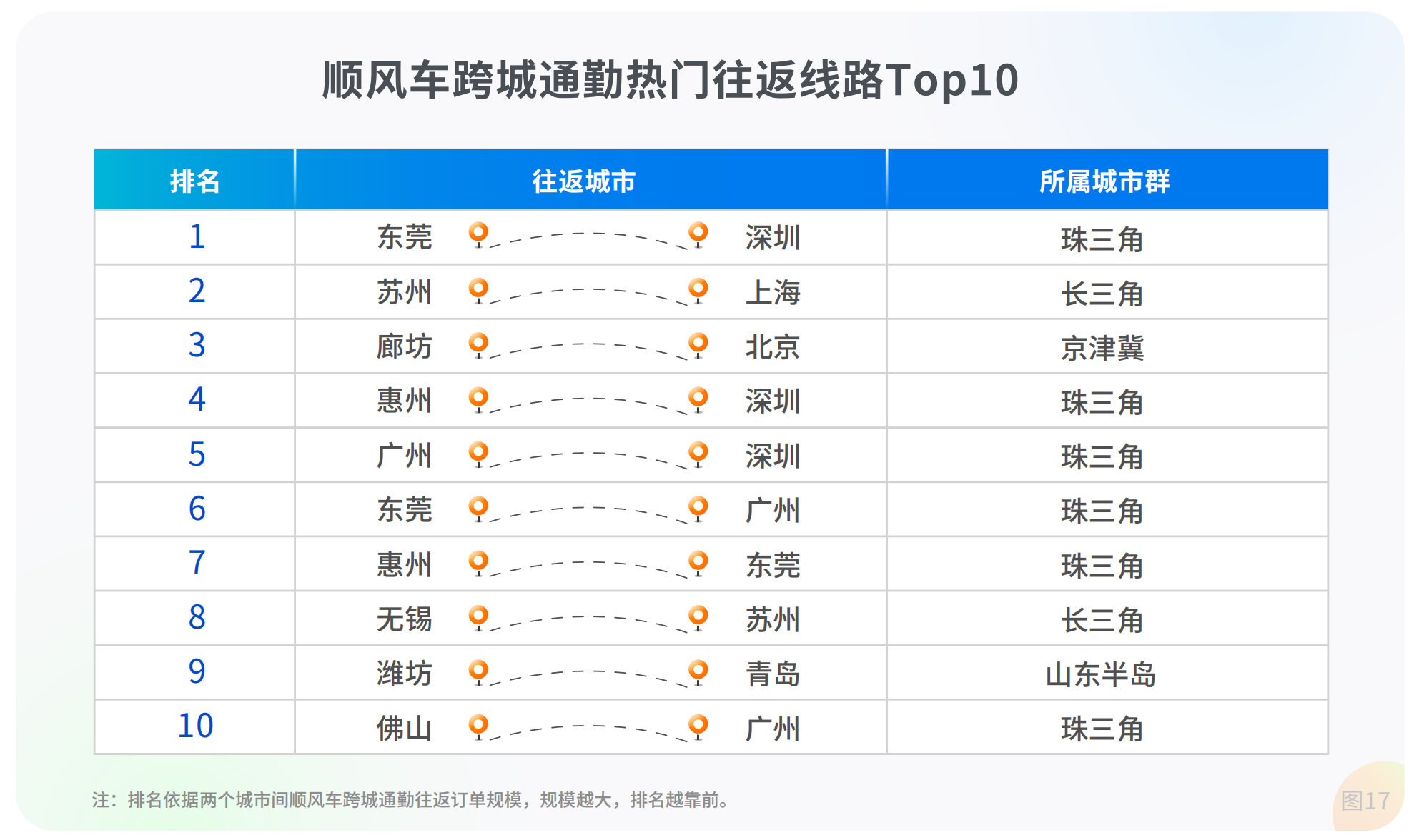 上述跨城通勤热门往返线路,主要城市群的顺风车跨城通勤规模排名,一定程度印证了各地区域一体化,带动了人才资源流动,促进了更多顺风车跨城跨省通勤。