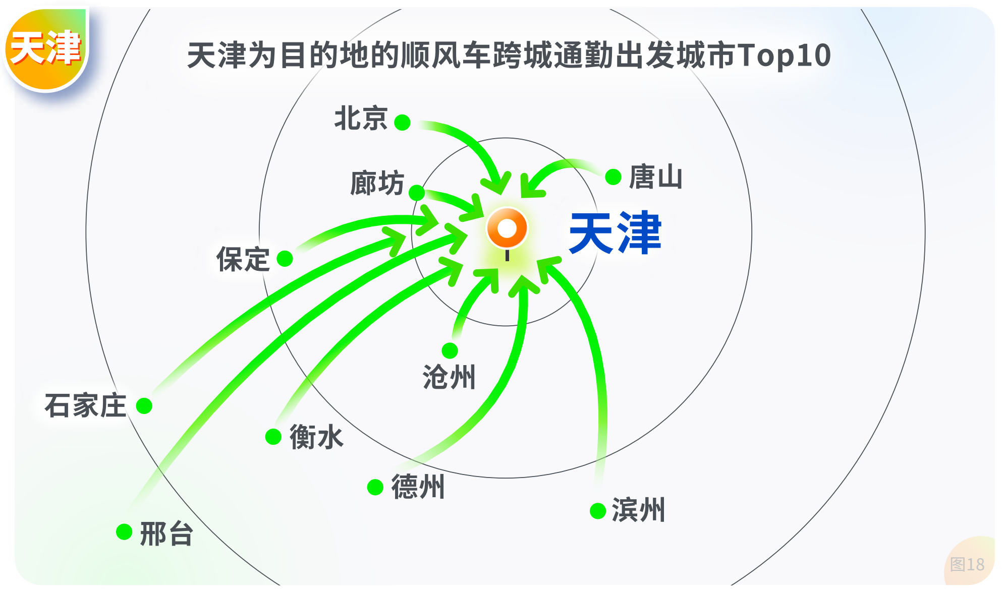 以天津为目的地的跨城通勤 Top10出发城市,前五依次是北京、廊坊、沧州、唐山和保定,且在 Top10城市前往天津的通勤订单总量中,北京-天津订单占比超五成,这一定程度反映出京津通勤的高频刚需。顺风车一站直达,帮助京津双城族提升了通勤品质和效率。