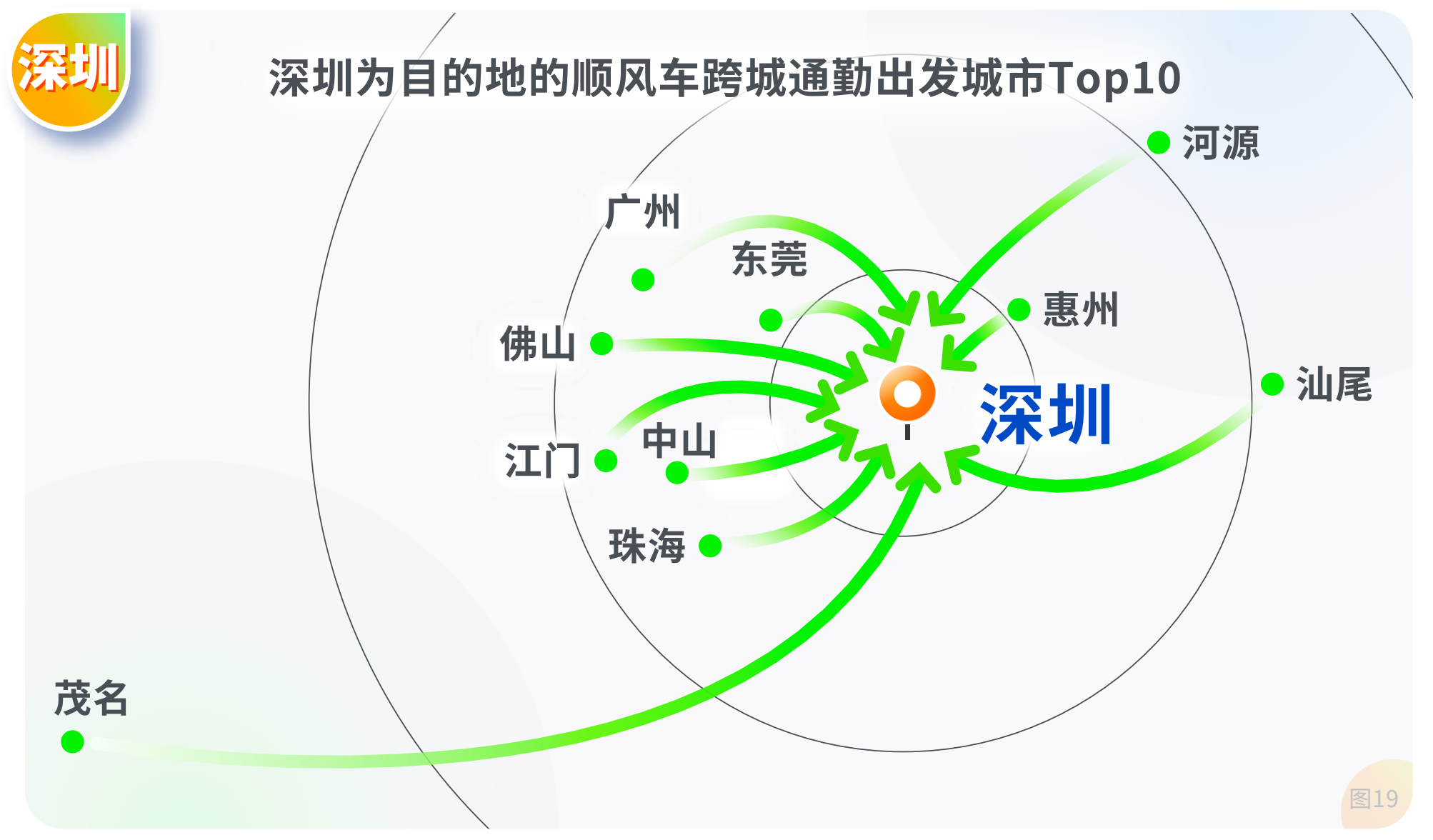 以深圳为目的地的跨城通勤Top10出发城市,前五依次是东莞、惠州、广州、佛山和中山。搭顺风车从深圳前往东莞、惠州、中山三城,预计时长均约1小时-1.5小时左右,且一站直达省去辗转。连接珠江口两岸的深中通道开通,让深圳、中山、广州、惠州等城市之间跨城通勤更为便捷。