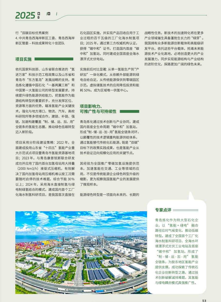 其中,中国石化青岛炼化建成全国首个工厂化海水制氢科研项目和全国首个全海水环境漂浮式光伏工业电站,通过全国首座碳中和加氢站认证,成为胶东地区唯一的燃料电池氢供应中心,入选“氢进万家”科技示范工程,为传统能源企业绿色低碳转型提供了可复制的工业耦合范式。
