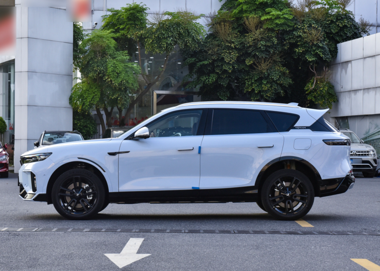 车身侧面,你可以看到新岚图FREE同样是主打一个运动风格。前低后高的车身设计营造出了一种俯冲的姿态,下方熏黑的轮毂也进一步强化了它的运动属性。