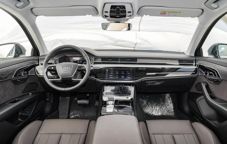 来到内饰,终于明白为什么老板不喜欢奥迪A8L,内饰整体布局与奥迪A6L相同,拉低奥迪A8L的豪华感。但它的用料确实达到豪车水准,比奥迪A6L更高级,比如车门处不仅有木纹饰板加持,还有绒毛材质+真皮包裹,但很遗憾车顶和中控台并没有采用绒毛材质。但它的座椅包裹性很好,乘坐起来蛮舒服,加上空气悬架支持软硬调节,以及沉稳的底盘质感都能为奥迪A8L带来高级的乘坐质感。液晶仪表还是12.3英寸,嵌入式中控屏维持10.1英寸,保留游艇式的电子档把以及触屏的空调设置,比较接近路虎的风格,营造出的科技感还是有的。