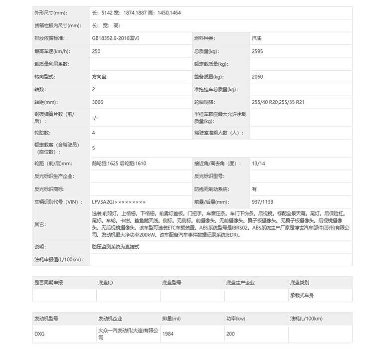 关于动力的配置,这一次提交的新车型搭载了DXG型号的2.0T发动机,它的最大输出能力高达200千瓦。