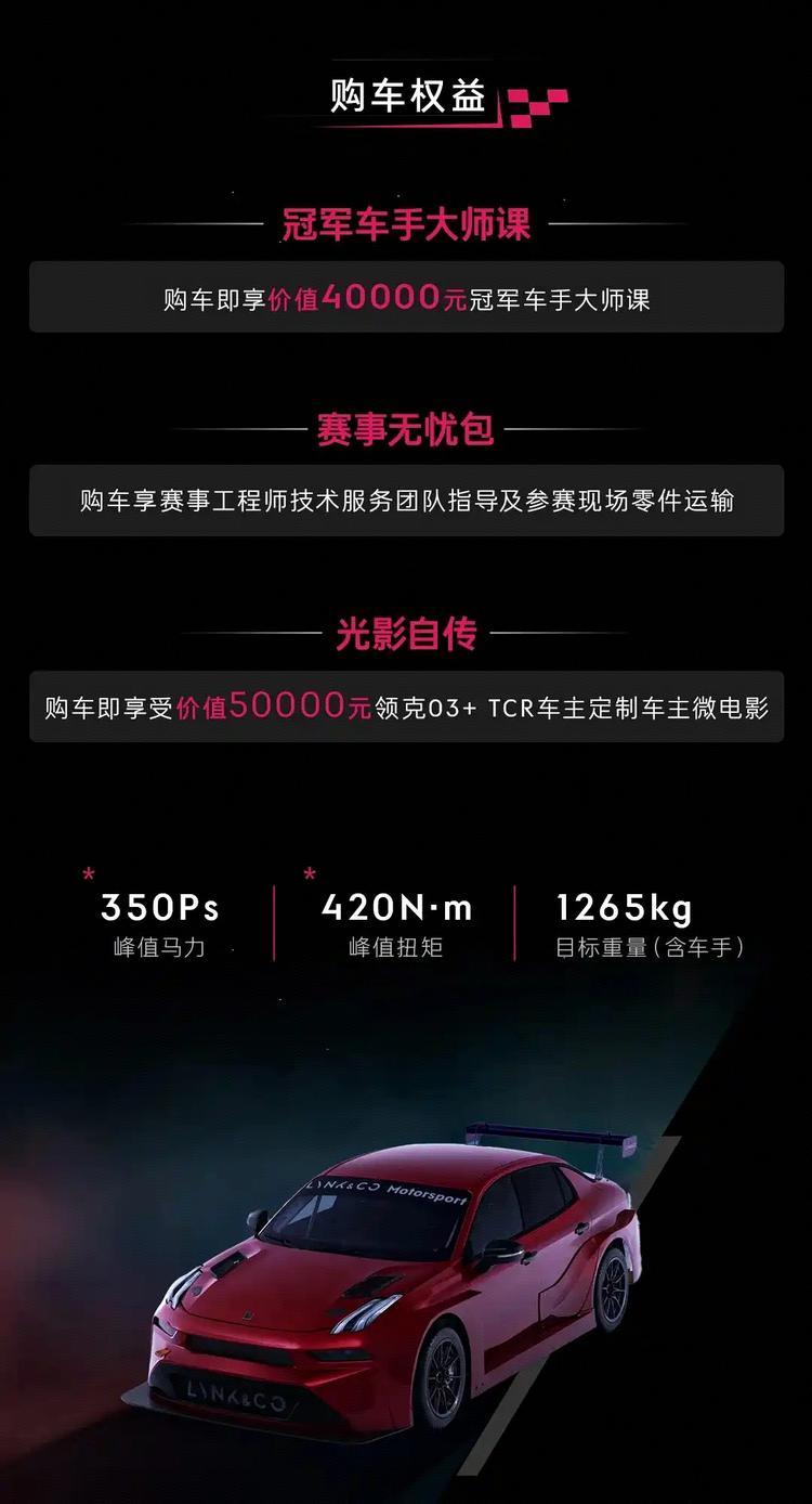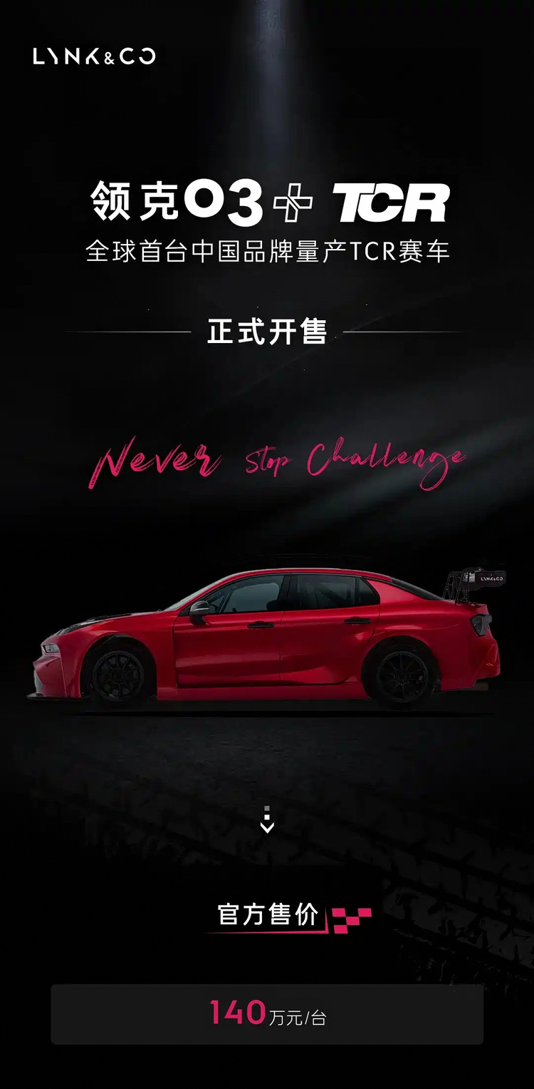 对于关注赛道文化和品牌赛车体系的消费者来说, 领克03+ TCR的出现并不属于常规意义上的性能车,而是直接向职业赛事看齐的量产赛车版本。官方公布售价为约140万元,适用于想进入TCR相关赛事或进行专业赛道练习的车主。该车的技术基础来自03 TCR厂队赛车,动力、空气动力学结构、底盘设定均围绕赛道工况开发,并按照TCR技术规则进行量产。在产品定位上,这款车并非面向日常通勤用户,因此在评估是否值得入手时,重点需要放在赛道表现、维护便利度、量产赛车合规性以及配套培训体系上。