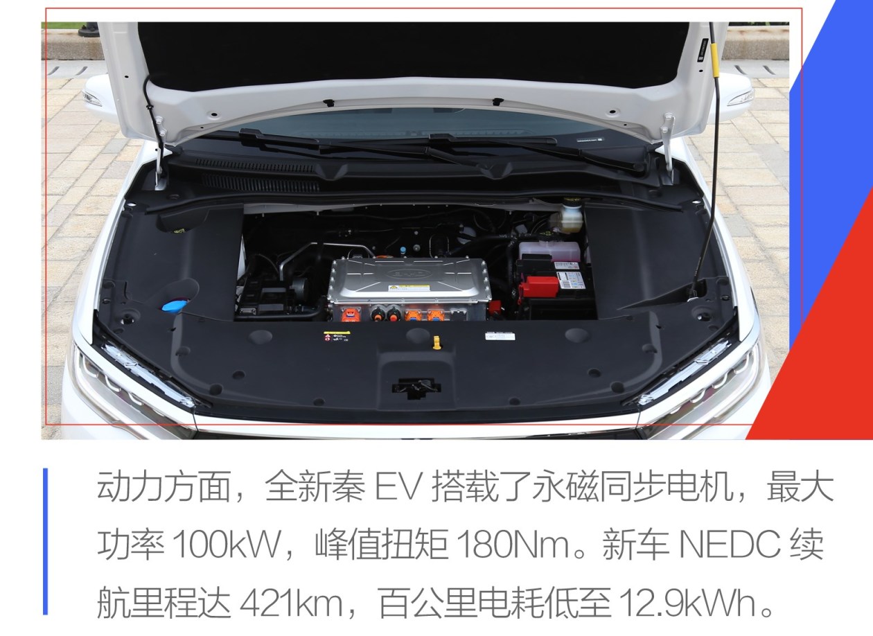动力方面,全新秦EV搭载了永磁同步电机,最大功率100kW,峰值扭矩180Nm。续航方面,新车搭载了自主研发的能量密度达到160kWh的三元锂电池,电池容量为53.1kWh,NEDC续航里程达421km,百公里电耗低至12.9kWh。
