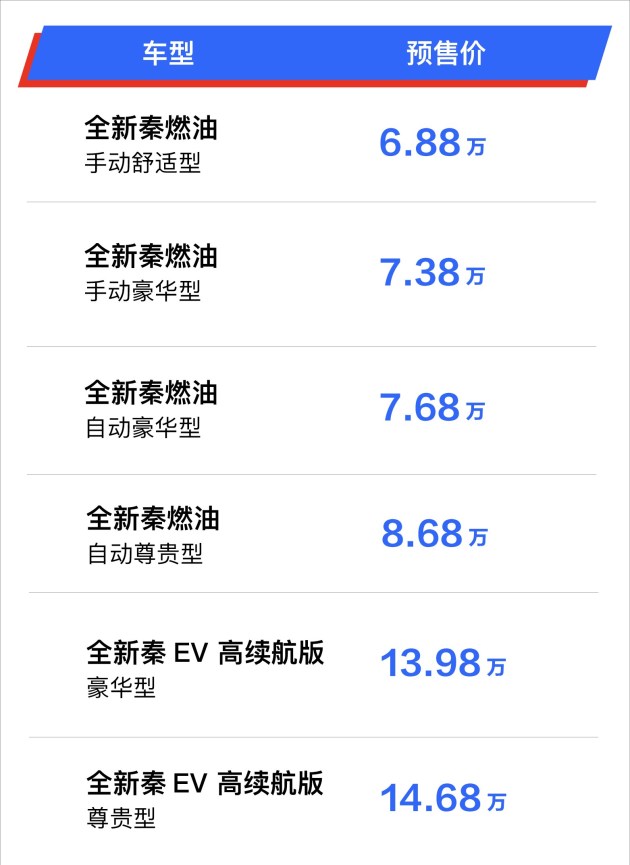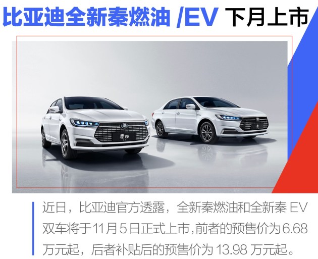 近日,比亚迪官方宣布全新秦燃油版和EV版车型将于11月5日正式上市。作为比亚迪王朝家族新的紧凑型家轿,全新秦此前已在成都车展开启预售。其中全新秦燃油版车型搭载1.5L自然吸气发动机,匹配5速手动变速箱和CVT变速箱,预售价为6.68万元起;EV版车型搭载100kW永磁同步电机,NEDC综合续航里程达421km,综合补贴后预售价为13.98万元起。