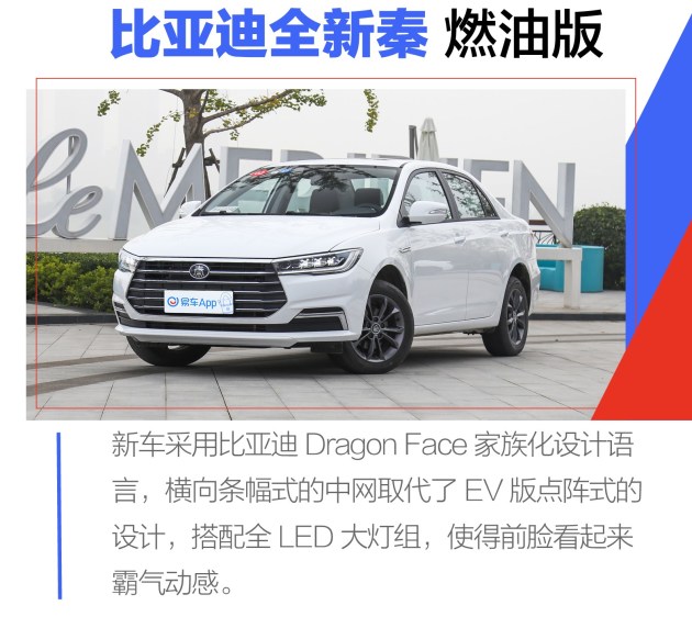 外观方面,全新秦燃油版与EV版基本保持一致。新车采用比亚迪Dragon Face家族化设计语言,横向条幅式的中网取代了EV版点阵式的设计,并搭载了矩阵式LED大灯组。尾部方面,新车同样采用了“小鸭尾”设计,并且使用镀铬亮条连接左右尾灯。车身尺寸方面,新车轴距与EV版保持一致,为2670mm,其长宽高分别为4675*1770*1480mm。